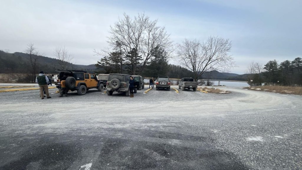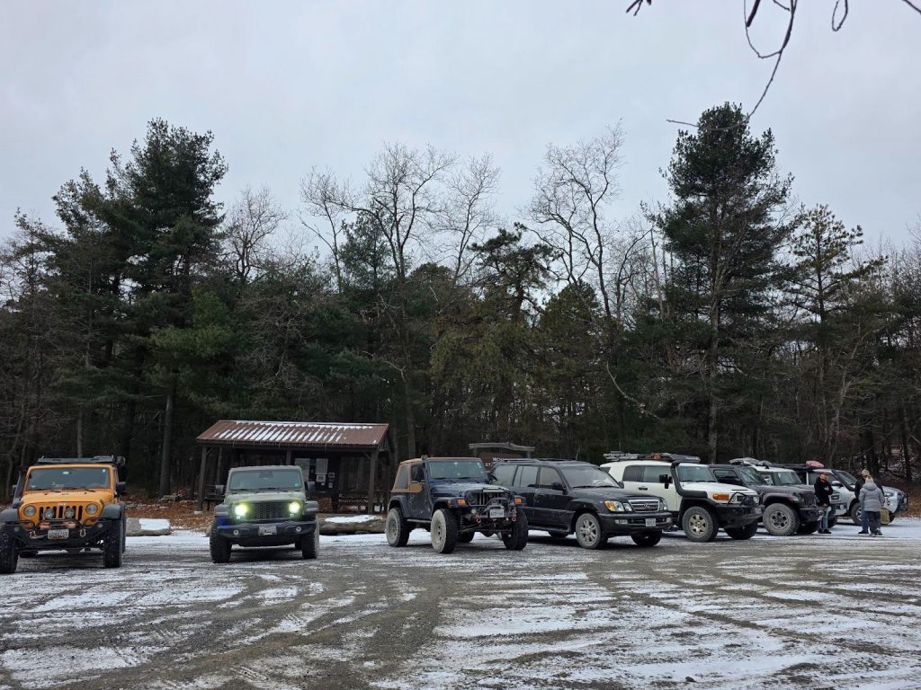 We hit the trail expecting a rutted climb up the mountain based on past trail rides.  We were a little disappointed to discover that the road had been graded and offered very little challenge.  With the leaves off the trees we were able to enjoy the views of the valley below as we drove along the ridge.  After a loop through the north part of the forest we stopped at the Big Flat ATV Parking Lot for lunch and a bathroom break.