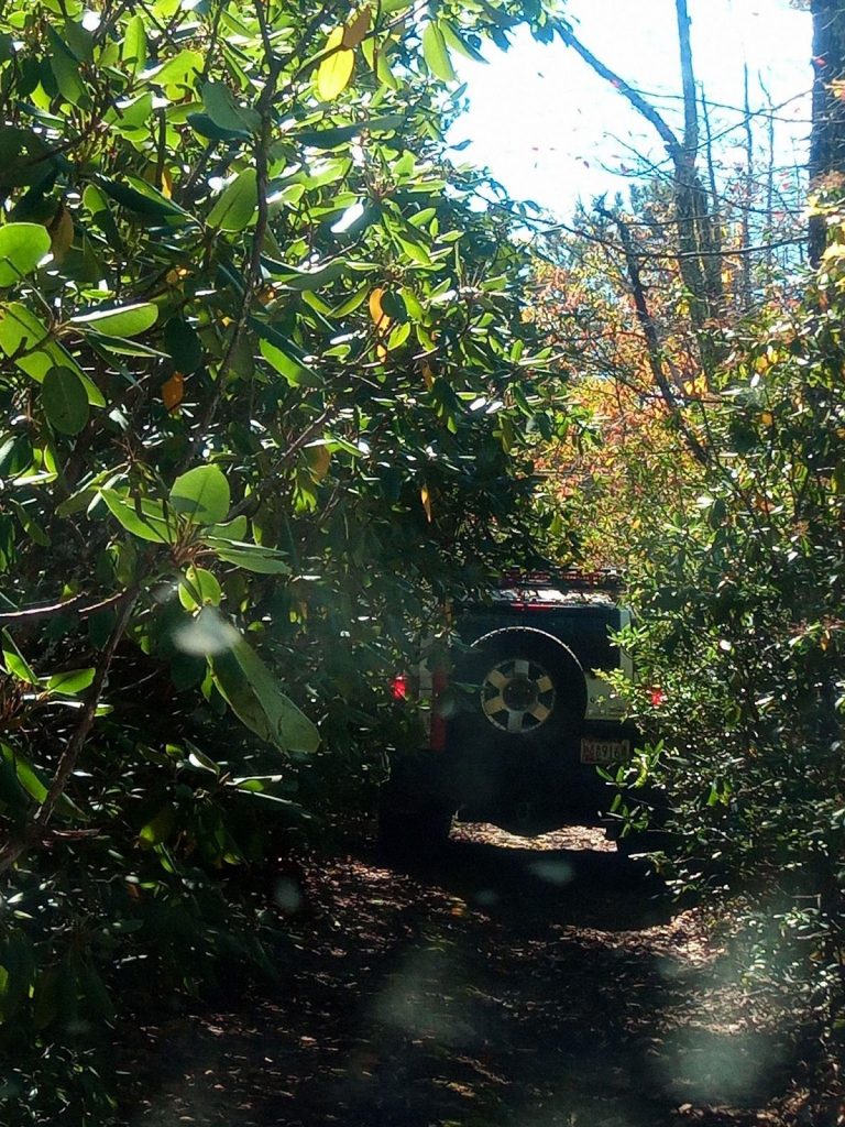 Just over five miles in we came to the second of the two dead end roads, 162B. This one goes off to the left and, wary after our first trail, we headed in figuring it couldn’t be that much worse than the first… It soon became clear that it could be worse and was so bad that even the bikes carved their own wheel line down the middle of the trail between the 4×4 two-tracks. After some vicious pinstriping, we reached the end of the driveable trail although a hiking trail did continue on further. After a brief break for lunch we headed back the way we came. On the way out, a tree branch grabbed Kirk’s snorkel so hard it broke the stainless steel clamp holding it on! His GMRS antenna that was mounted to his snorkel was also left dangling. While looking for the missing parts of Kirk’s snorkel, Jesse found another snorkel top claimed by nature lying just off the trail! After some creative use of zipties and parachord the group made their way back to the main trail relieved to be done with the trail. Kirk and Ben said it was probably the worst pinstripping they had ever dealt with.