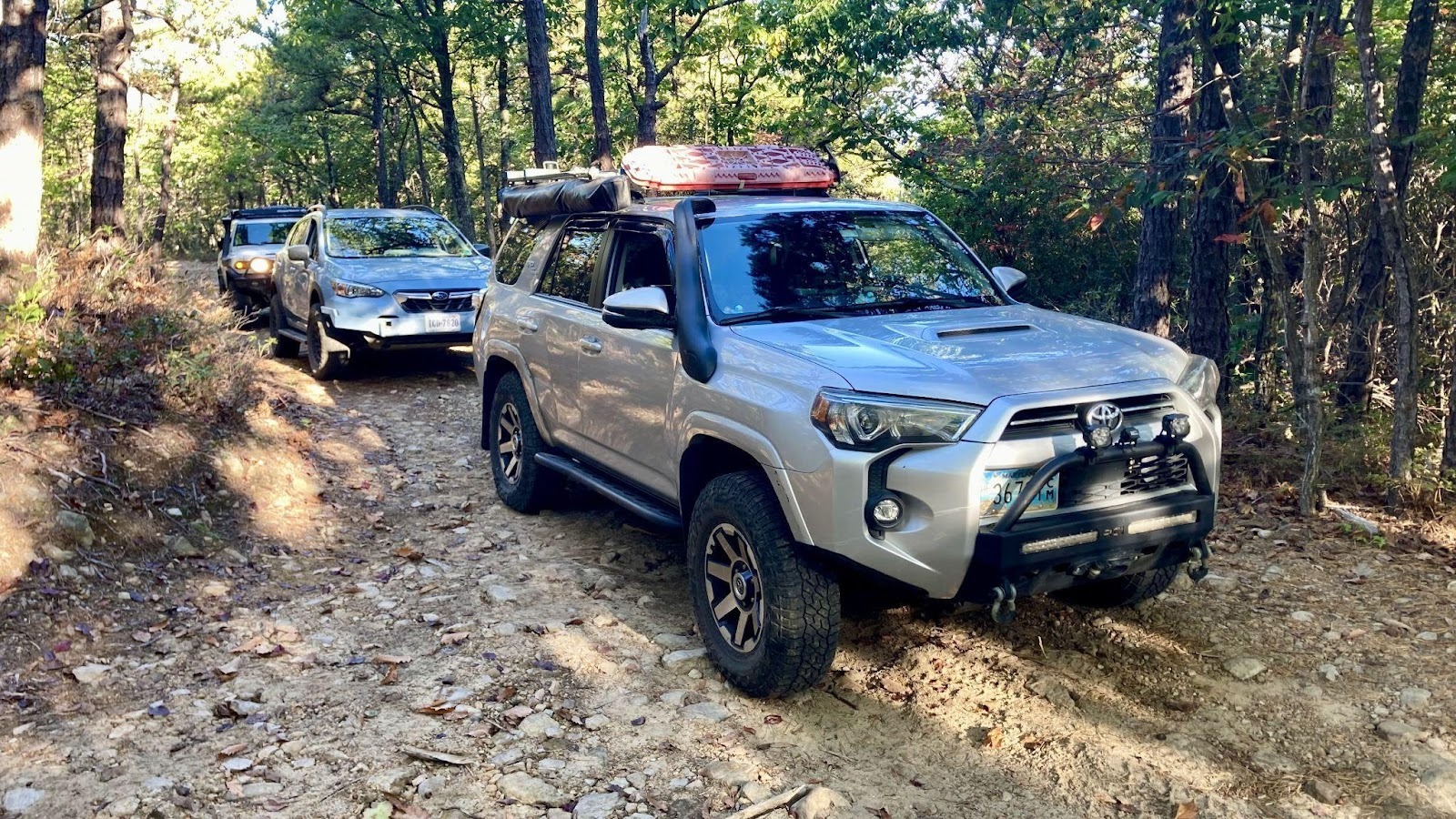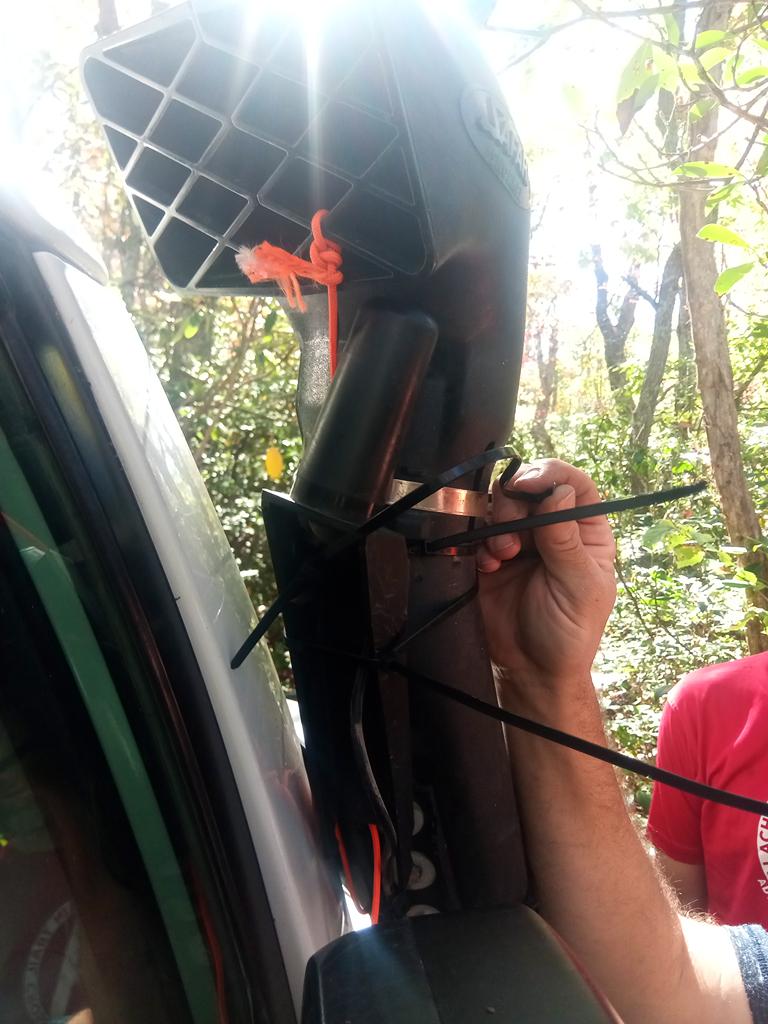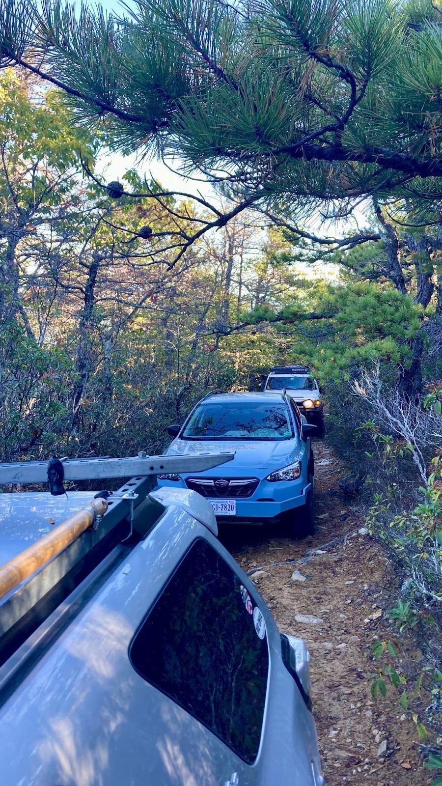 Just over five miles in we came to the second of the two dead end roads, 162B. This one goes off to the left and, wary after our first trail, we headed in figuring it couldn’t be that much worse than the first… It soon became clear that it could be worse and was so bad that even the bikes carved their own wheel line down the middle of the trail between the 4×4 two-tracks. After some vicious pinstriping, we reached the end of the driveable trail although a hiking trail did continue on further. After a brief break for lunch we headed back the way we came. On the way out, a tree branch grabbed Kirk’s snorkel so hard it broke the stainless steel clamp holding it on! His GMRS antenna that was mounted to his snorkel was also left dangling. While looking for the missing parts of Kirk’s snorkel, Jesse found another snorkel top claimed by nature lying just off the trail! After some creative use of zipties and parachord the group made their way back to the main trail relieved to be done with the trail. Kirk and Ben said it was probably the worst pinstripping they had ever dealt with.