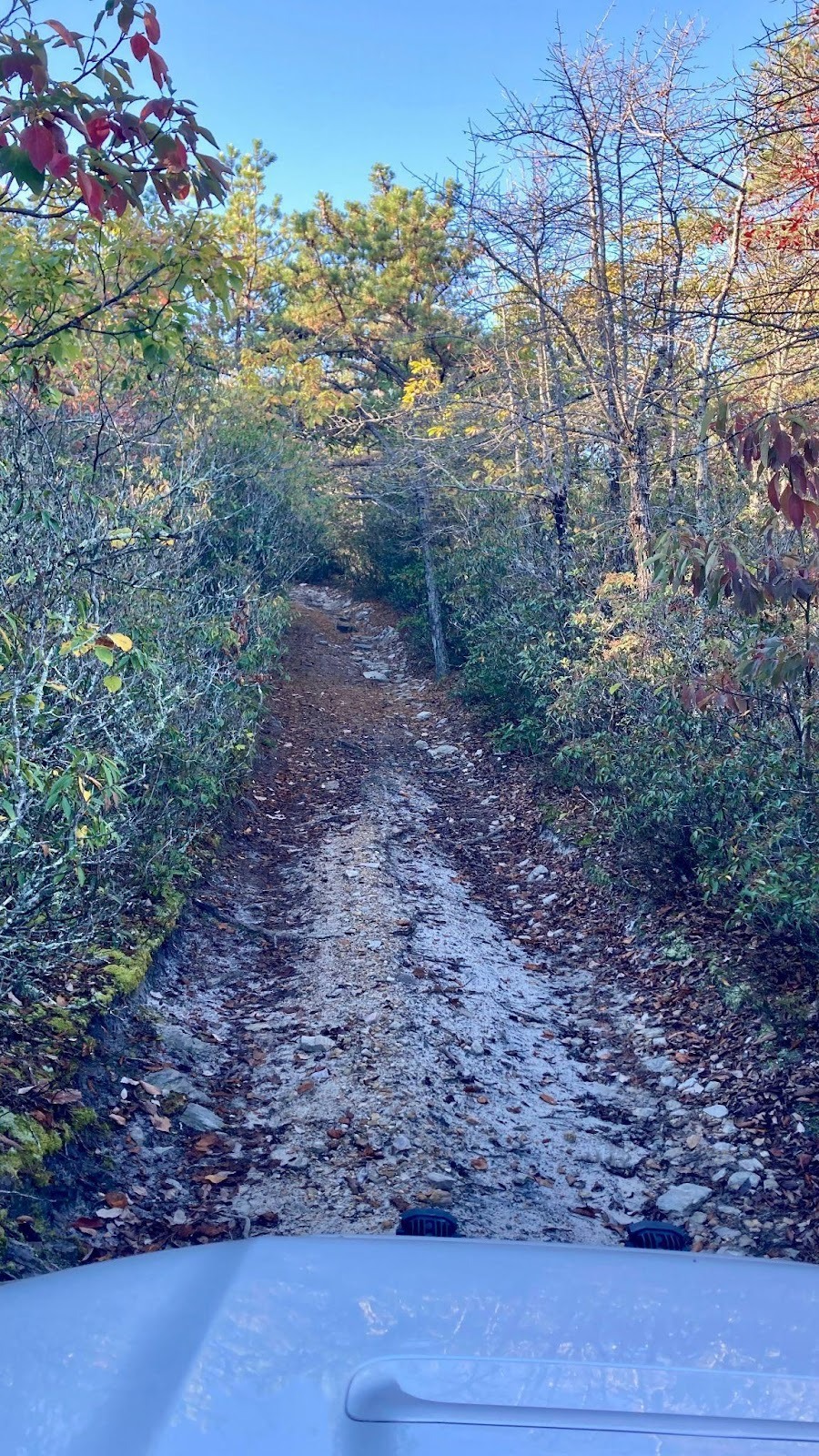 About 1.7 miles into the trail they came to a fork in the trail where the club has gone left in recent years. The left fork takes 1.5 miles to climb the mountain up some switchbacks and the right fork takes a more direct 0.8 mile route up the mountain. Despite being steeper there were no notable obstacles. The right fork did seem slightly narrow with some pinstriping that the left fork didn’t have in the summer.