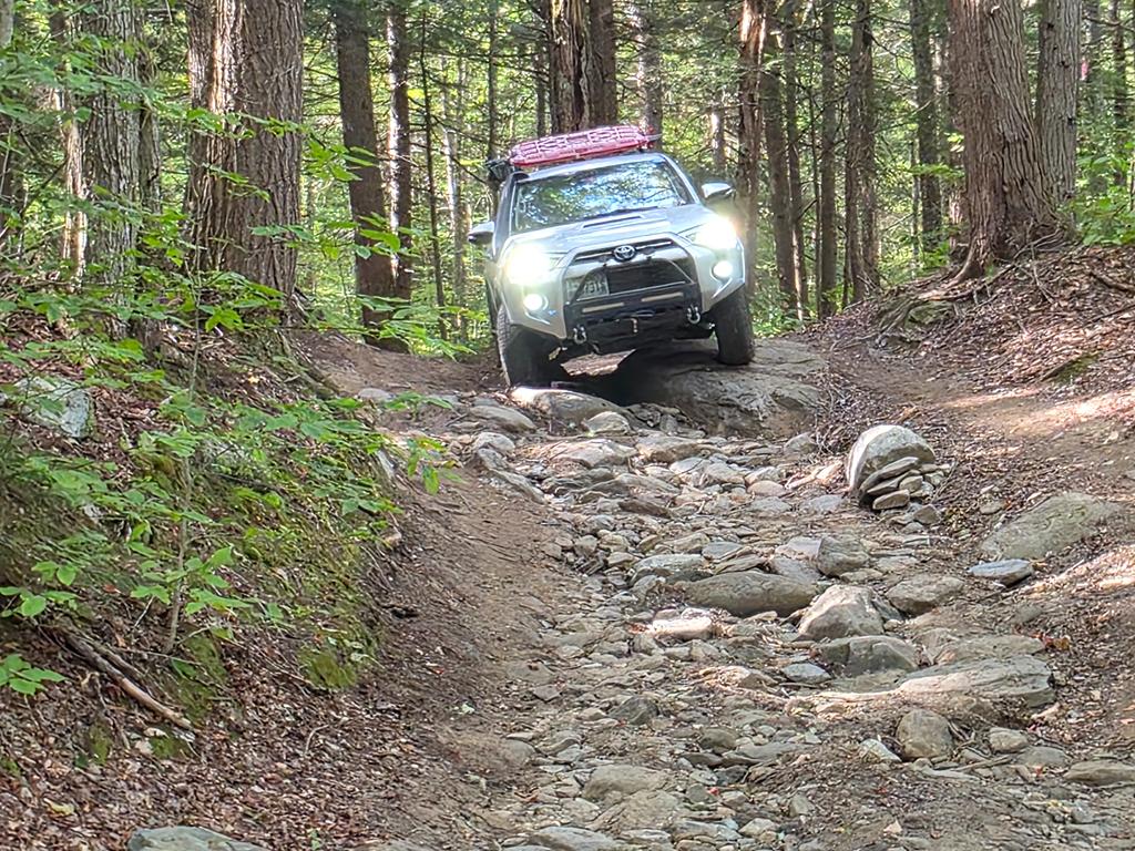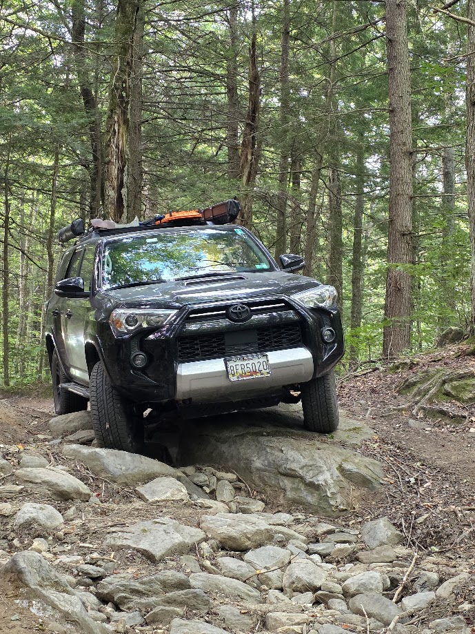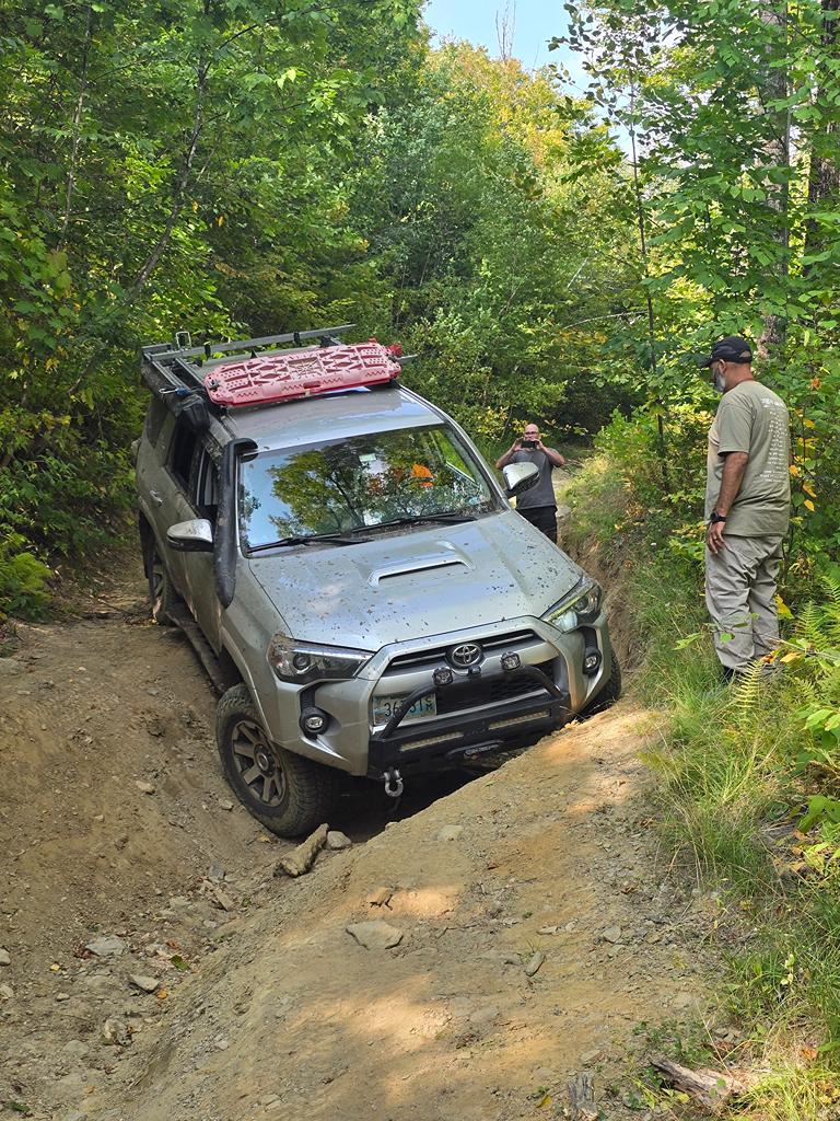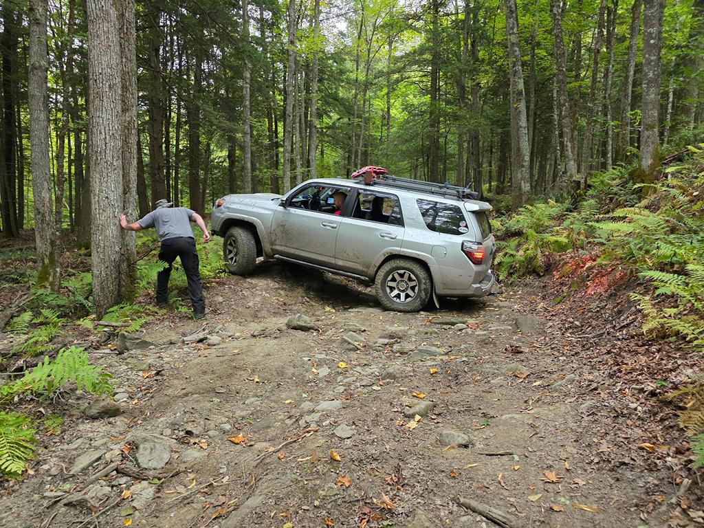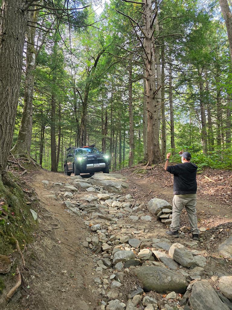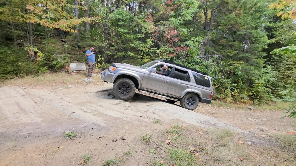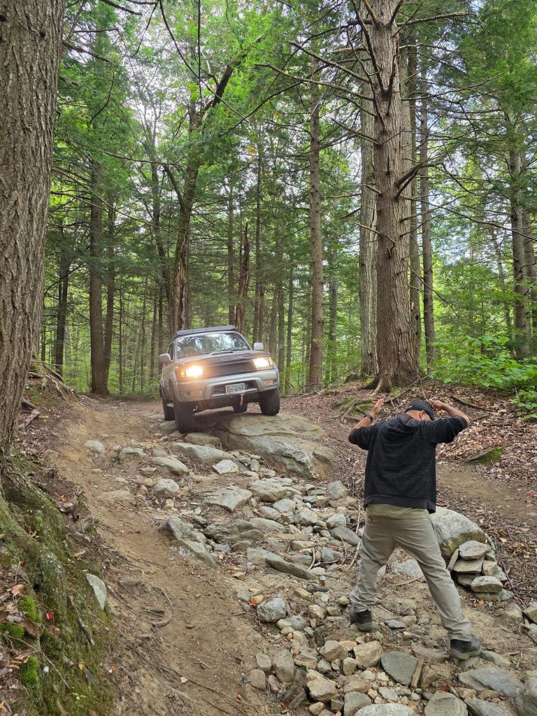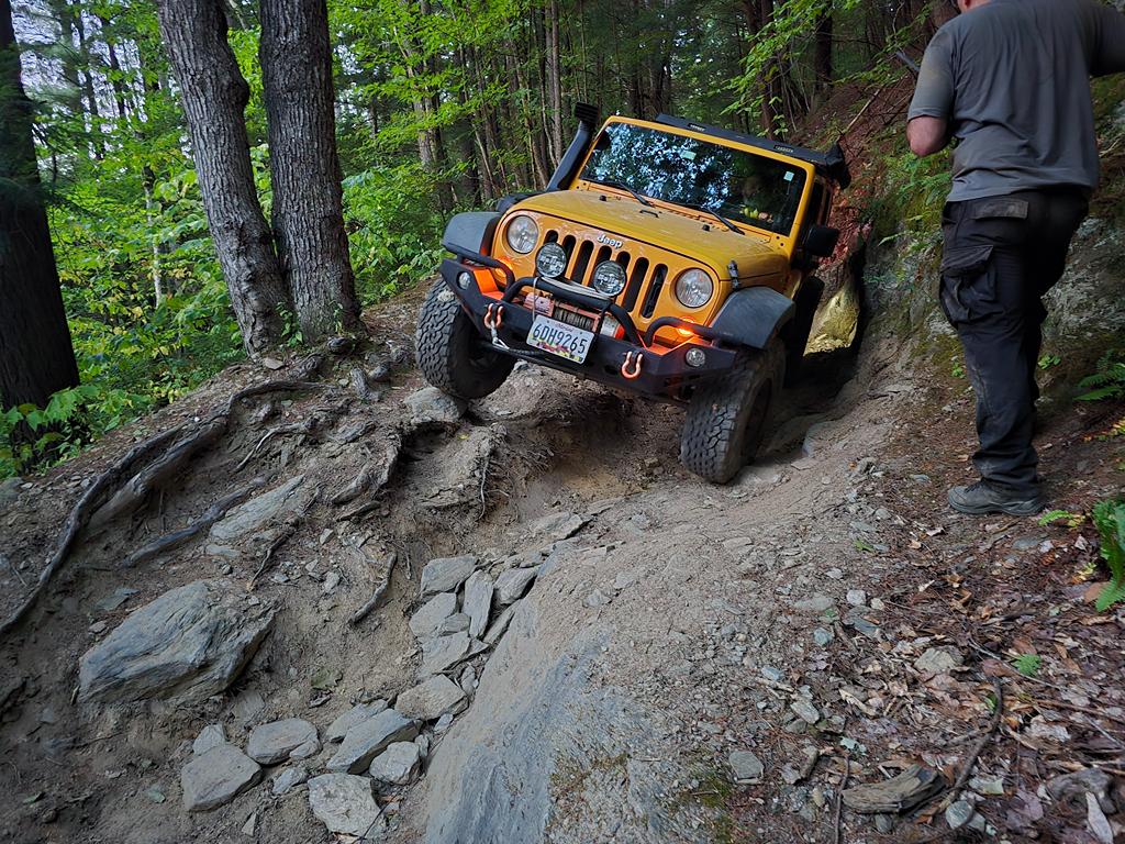We continued on slowly conquering difficult obstacles until we reached the final obstacle of the trail, which was simply impassable in our vehicles (and seemingly any other street vehicle). We did not get any pictures or video of this obstacle, but it was a pair of large boulders on either side of a tight curvy ditch – the best line we saw would require the vehicle to be off camber enough to rub one of the boulders if not just rollover. Once home, we found a few videos of this trail (the newest one being from almost a year prior) and this obstacle didn’t appear to be quite as difficult. Vermont has had some hard rains and flooding this summer, which I believe washed this obstacle out making it as difficult as we saw it.