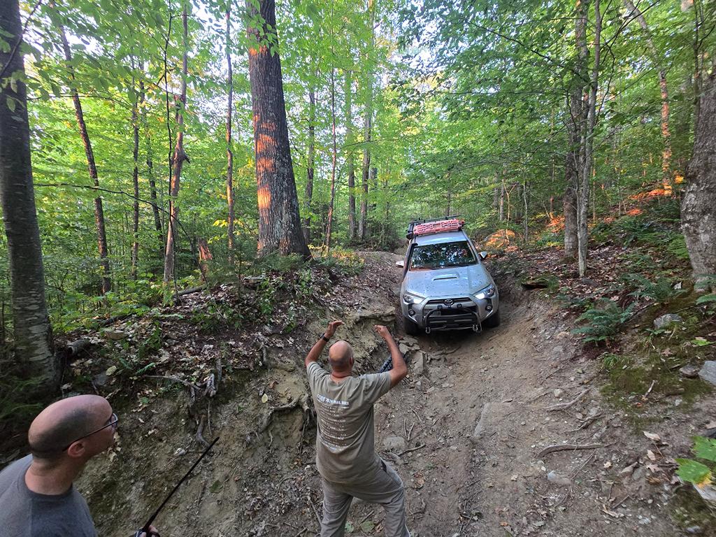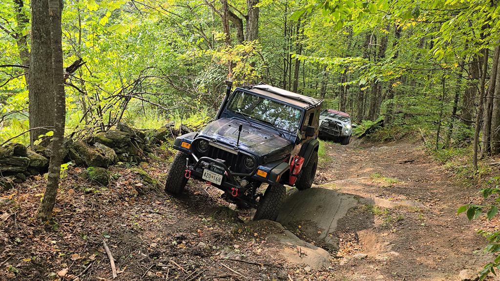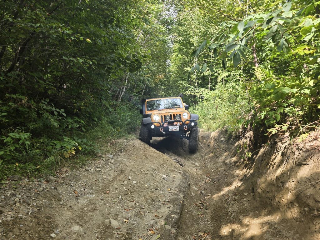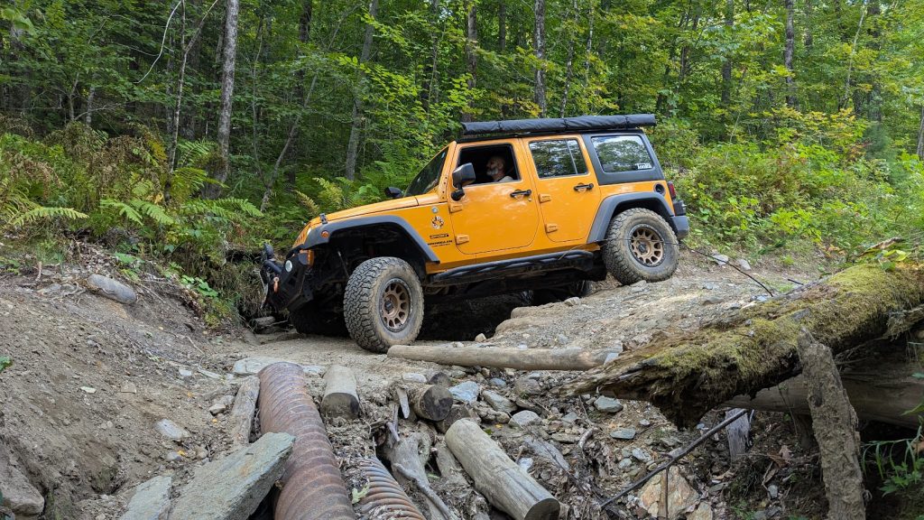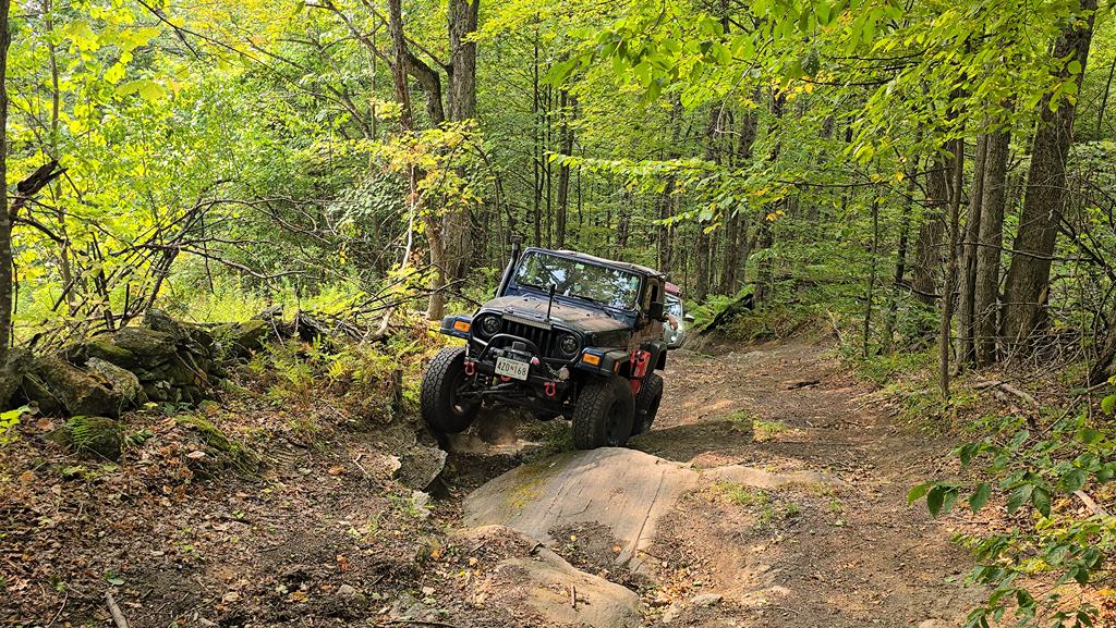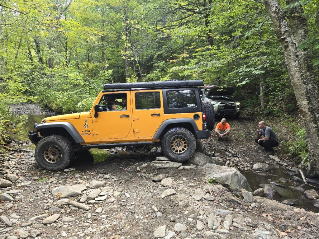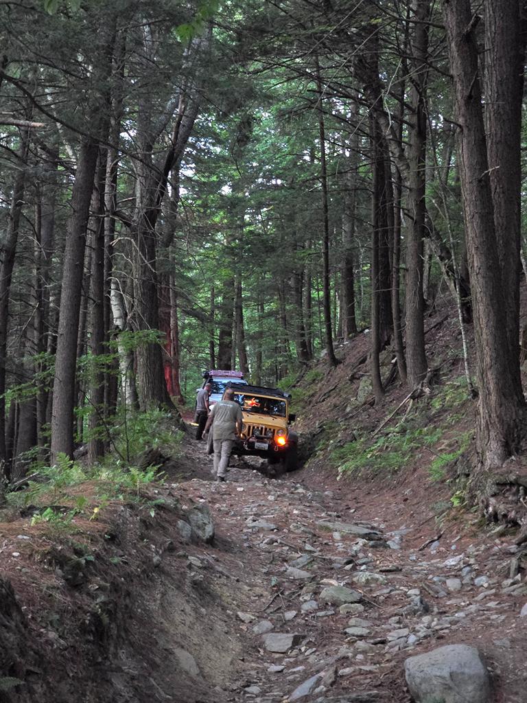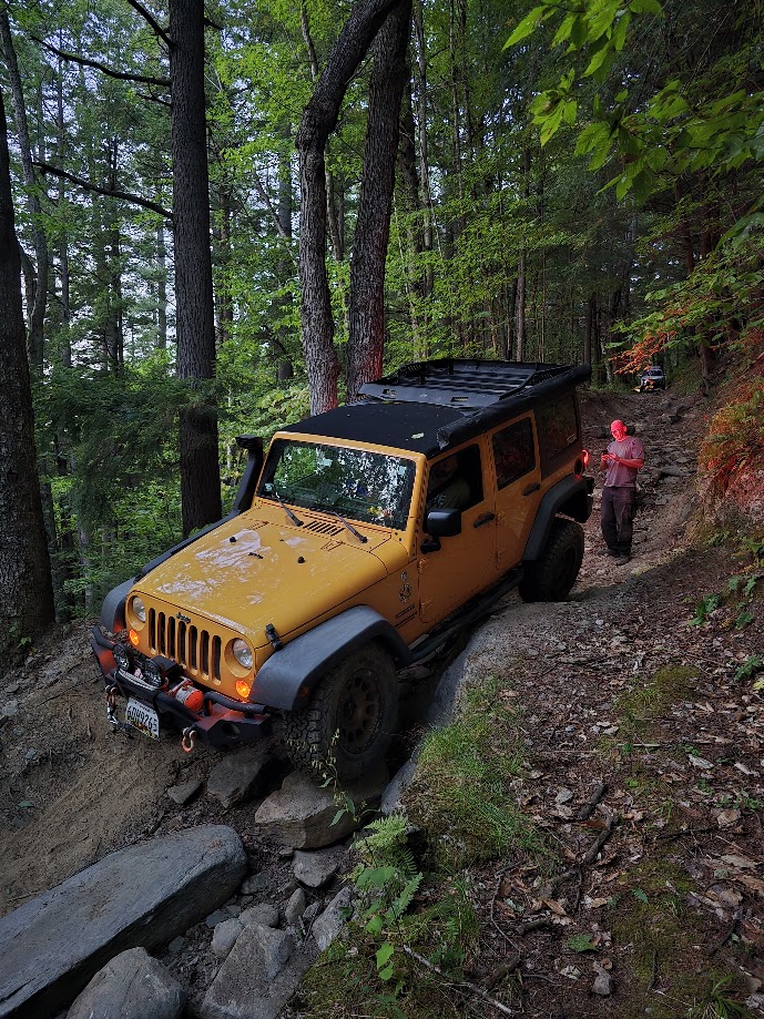 We continued on slowly conquering difficult obstacles until we reached the final obstacle of the trail, which was simply impassable in our vehicles (and seemingly any other street vehicle). We did not get any pictures or video of this obstacle, but it was a pair of large boulders on either side of a tight curvy ditch – the best line we saw would require the vehicle to be off camber enough to rub one of the boulders if not just rollover. Once home, we found a few videos of this trail (the newest one being from almost a year prior) and this obstacle didn’t appear to be quite as difficult. Vermont has had some hard rains and flooding this summer, which I believe washed this obstacle out making it as difficult as we saw it.