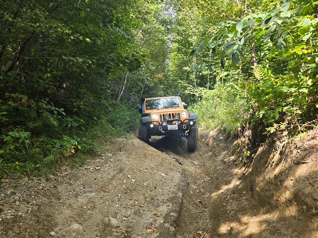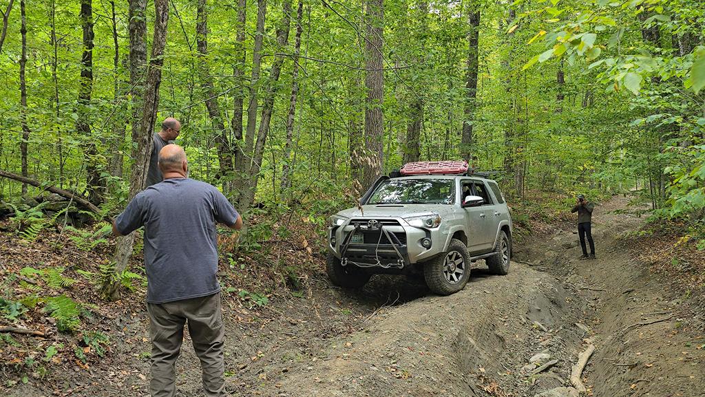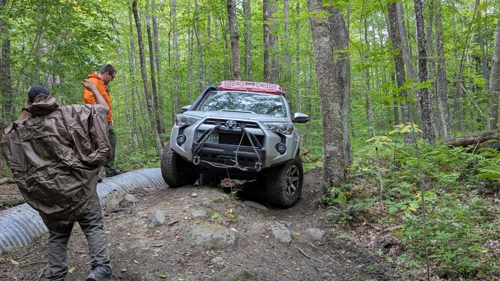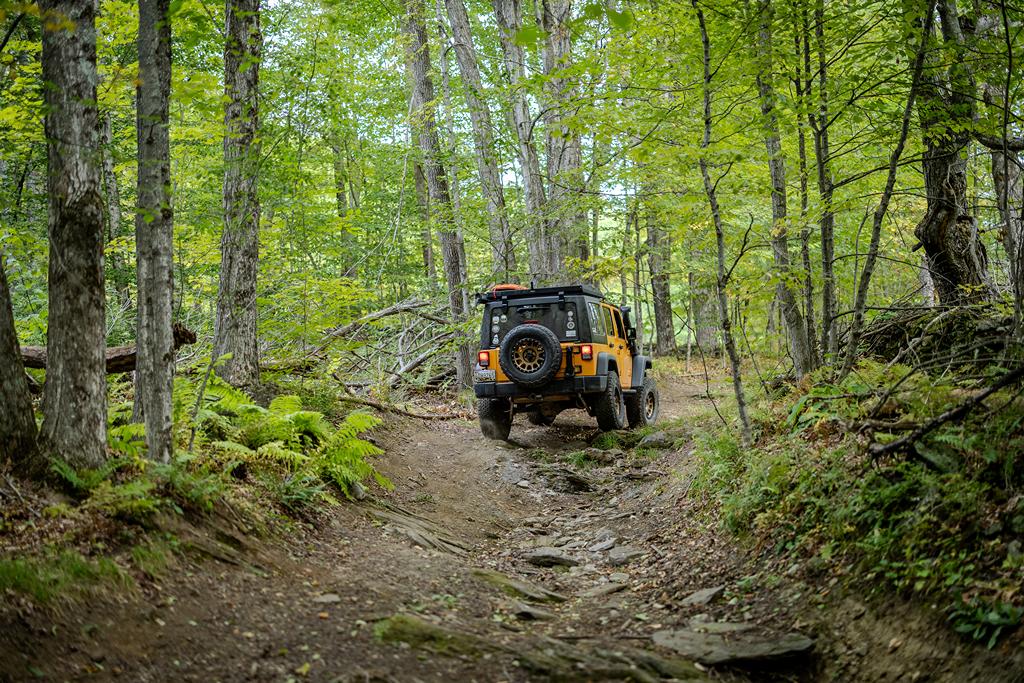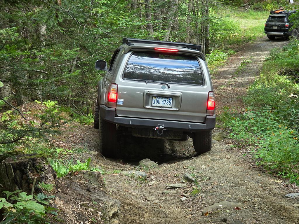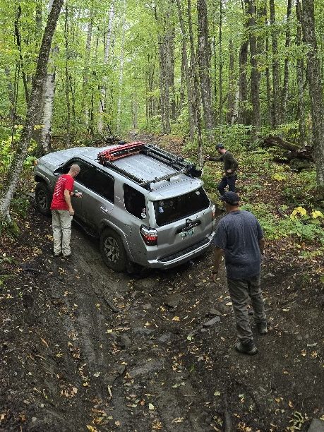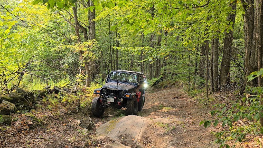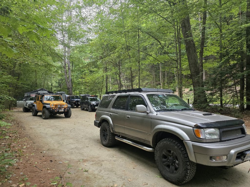 We continued on slowly conquering difficult obstacles until we reached the final obstacle of the trail, which was simply impassable in our vehicles (and seemingly any other street vehicle). We did not get any pictures or video of this obstacle, but it was a pair of large boulders on either side of a tight curvy ditch – the best line we saw would require the vehicle to be off camber enough to rub one of the boulders if not just rollover. Once home, we found a few videos of this trail (the newest one being from almost a year prior) and this obstacle didn’t appear to be quite as difficult. Vermont has had some hard rains and flooding this summer, which I believe washed this obstacle out making it as difficult as we saw it.