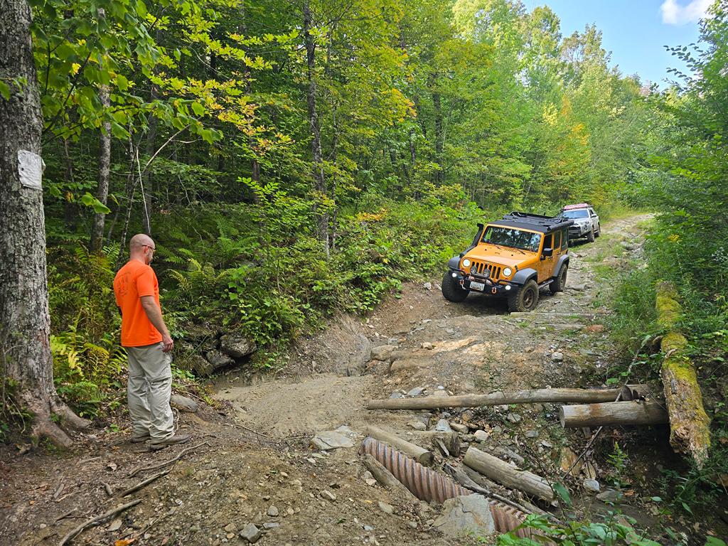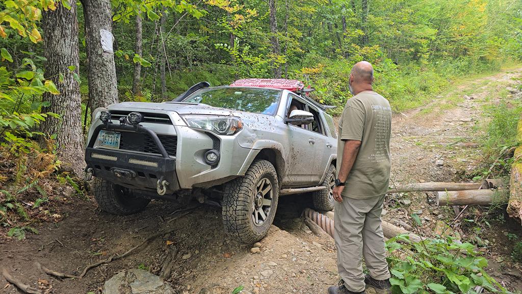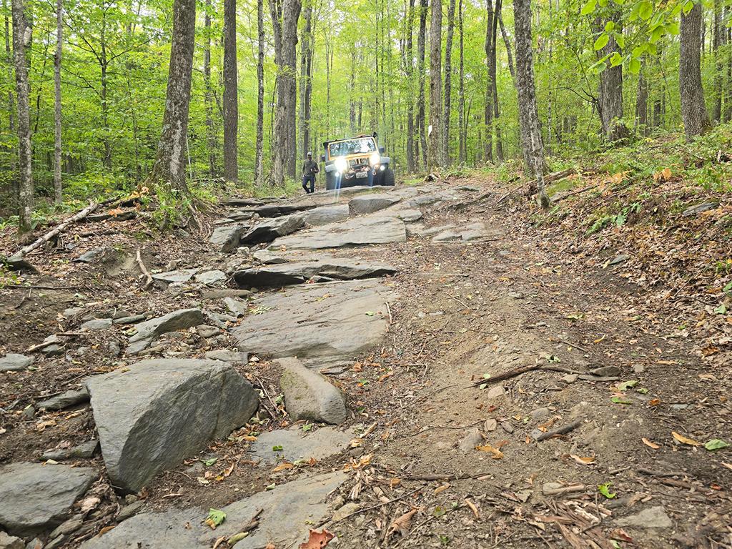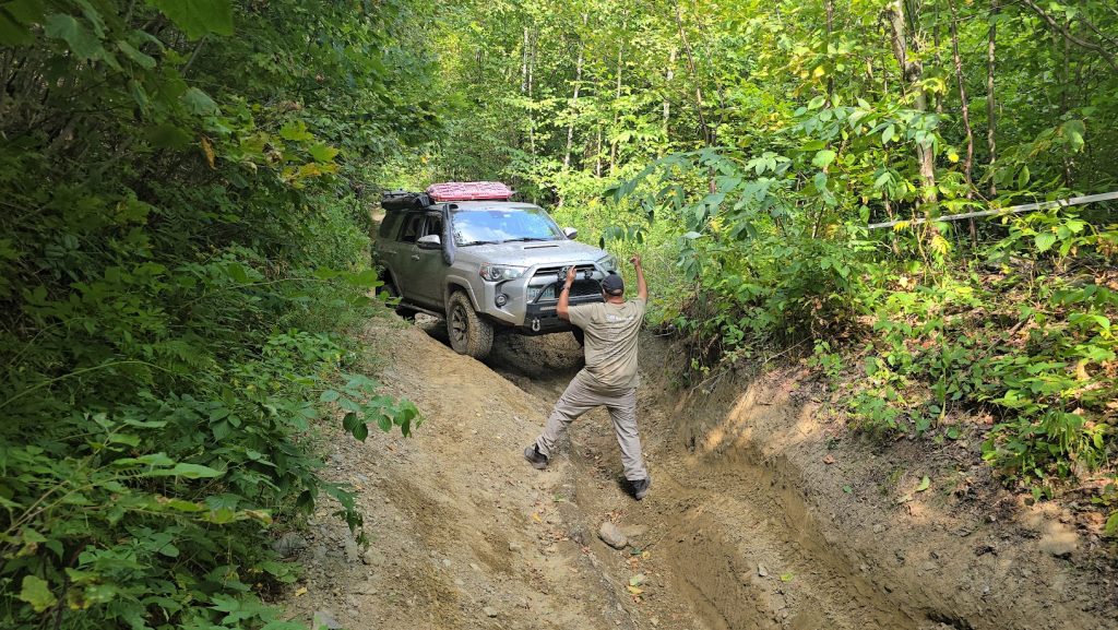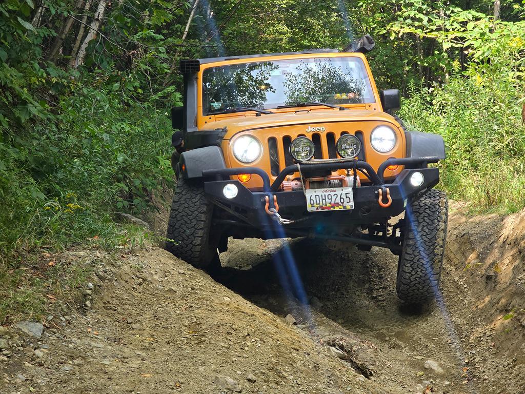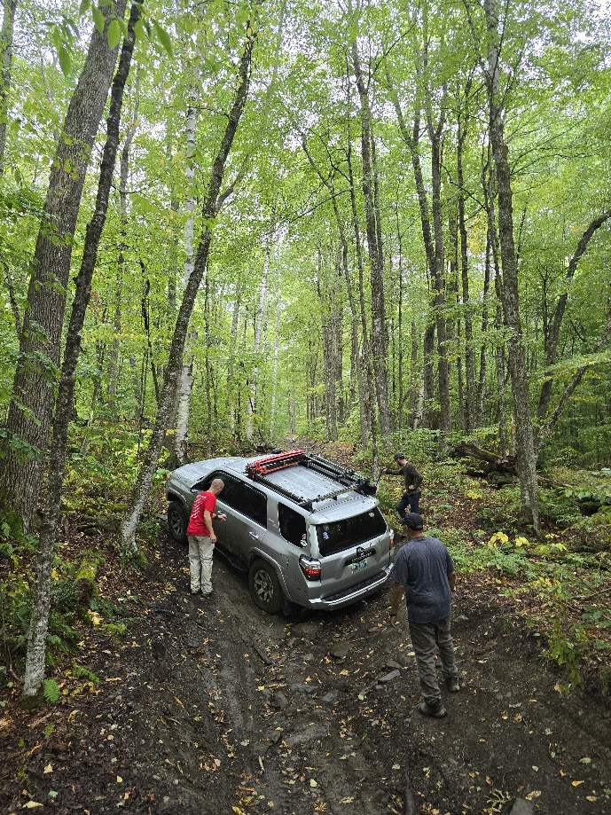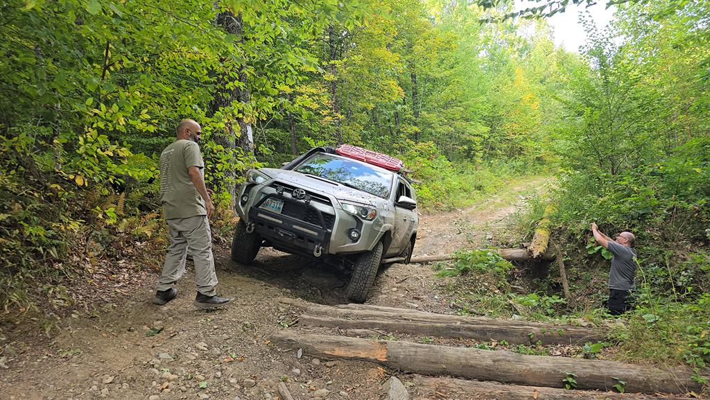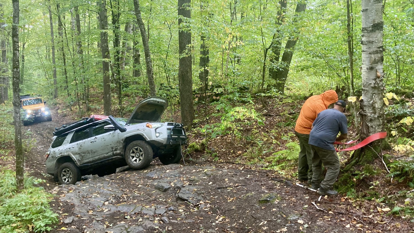 We continued on slowly conquering difficult obstacles until we reached the final obstacle of the trail, which was simply impassable in our vehicles (and seemingly any other street vehicle). We did not get any pictures or video of this obstacle, but it was a pair of large boulders on either side of a tight curvy ditch – the best line we saw would require the vehicle to be off camber enough to rub one of the boulders if not just rollover. Once home, we found a few videos of this trail (the newest one being from almost a year prior) and this obstacle didn’t appear to be quite as difficult. Vermont has had some hard rains and flooding this summer, which I believe washed this obstacle out making it as difficult as we saw it.