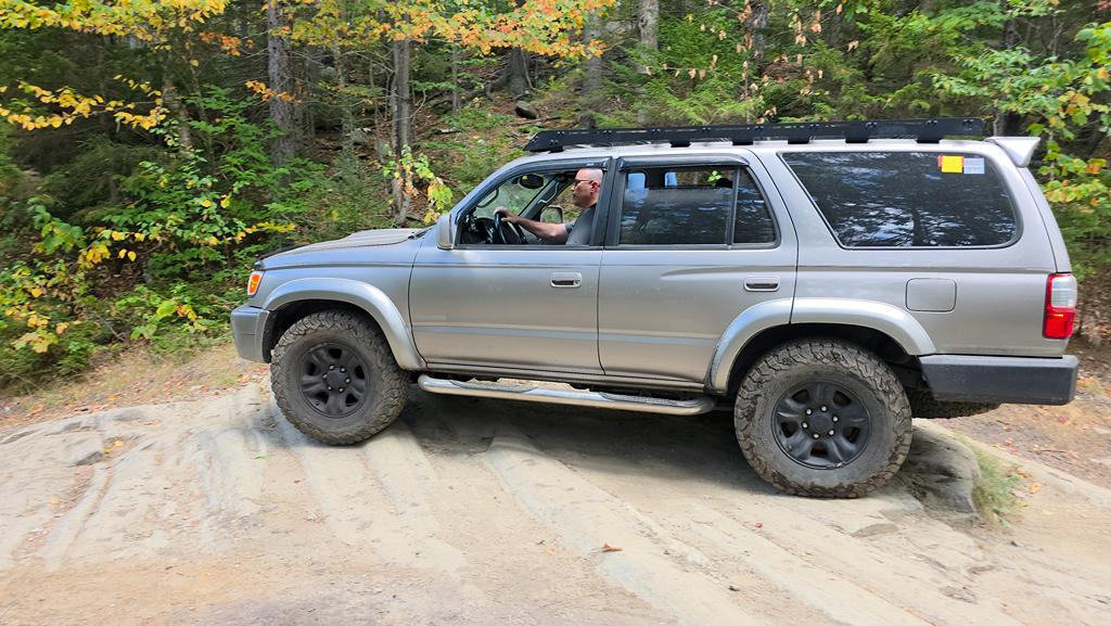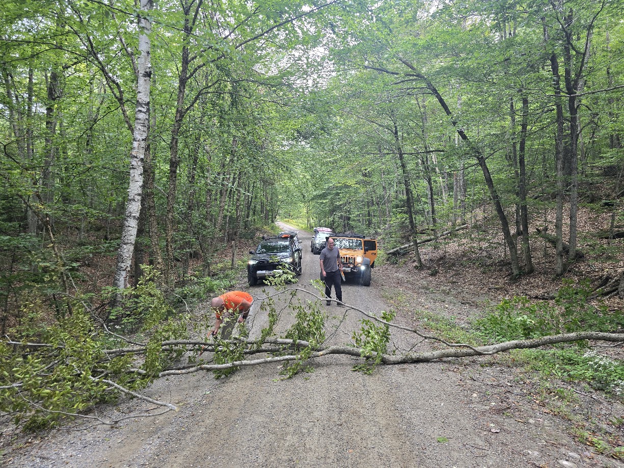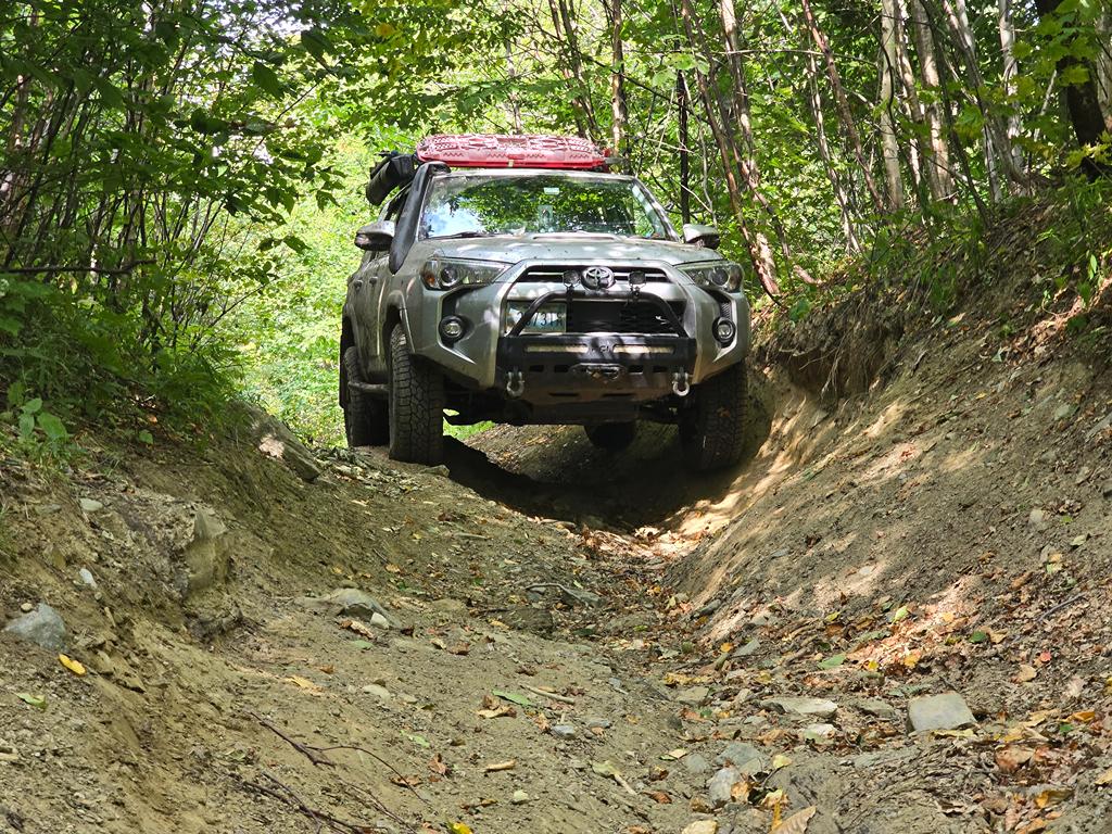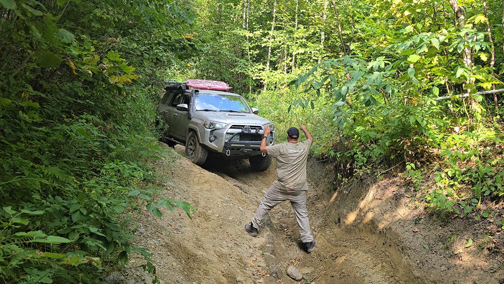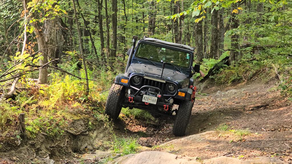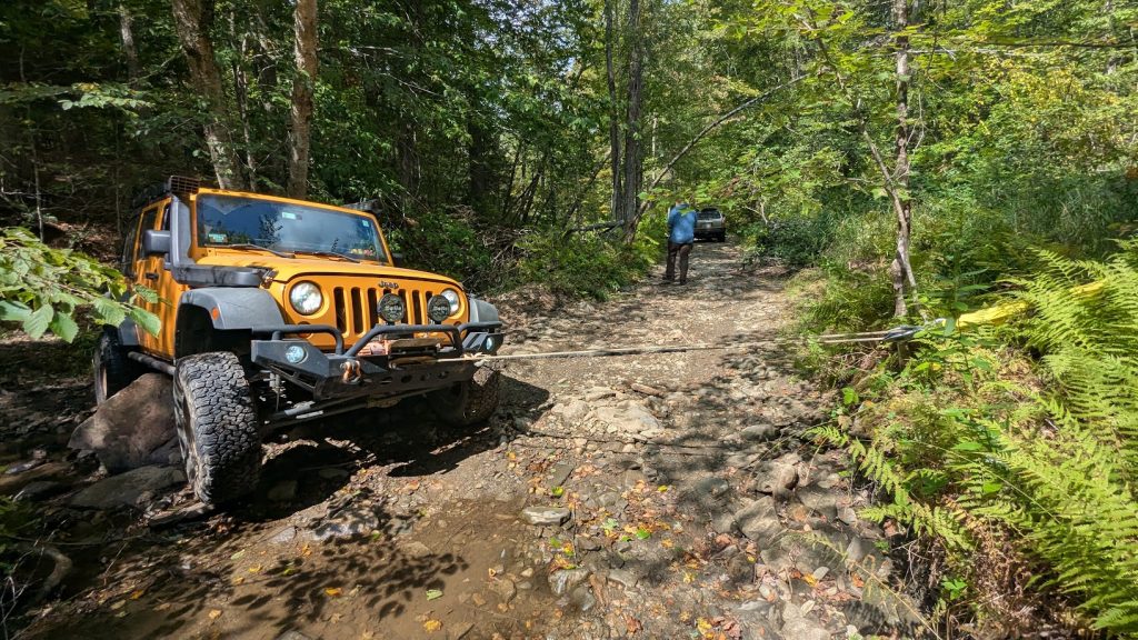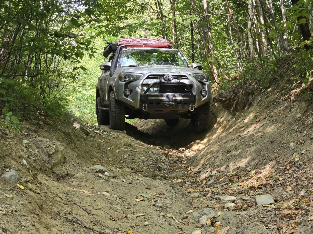 We continued on slowly conquering difficult obstacles until we reached the final obstacle of the trail, which was simply impassable in our vehicles (and seemingly any other street vehicle). We did not get any pictures or video of this obstacle, but it was a pair of large boulders on either side of a tight curvy ditch – the best line we saw would require the vehicle to be off camber enough to rub one of the boulders if not just rollover. Once home, we found a few videos of this trail (the newest one being from almost a year prior) and this obstacle didn’t appear to be quite as difficult. Vermont has had some hard rains and flooding this summer, which I believe washed this obstacle out making it as difficult as we saw it.
